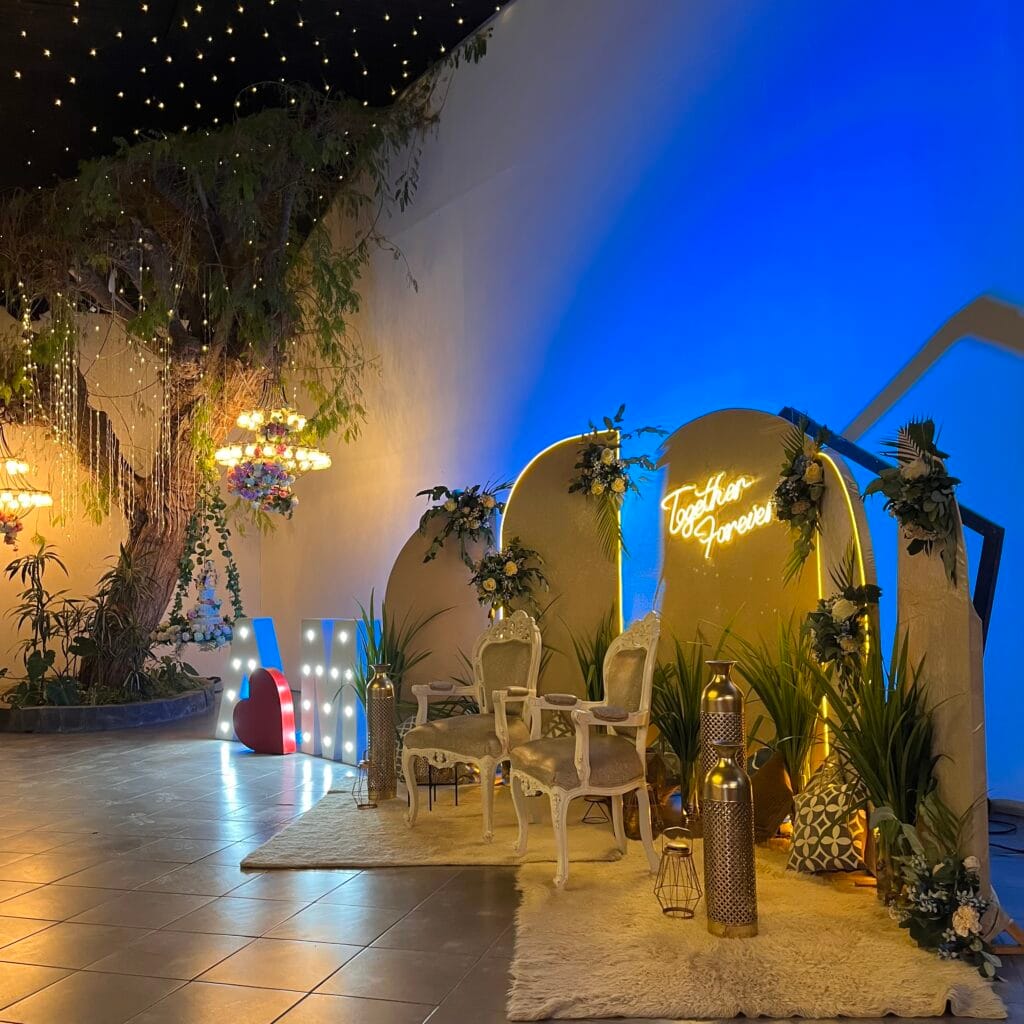 La noche llegó, y el salón de El Hueco se vistió de un aire de ensueño, uniendo a la perfección la elegancia con la magia. Bajo un techo salpicado de luces que simulaban un cielo estrellado, cada rincón susurraba la historia de amor de los novios. El ambiente, iluminado por una luz dorada y cálida, se sentía íntimo y solemne. Al centro, un rincón especial esperaba, con las iniciales A y M brillando con luz propia y un mensaje en neón que sellaba la noche: «Together Forever.»