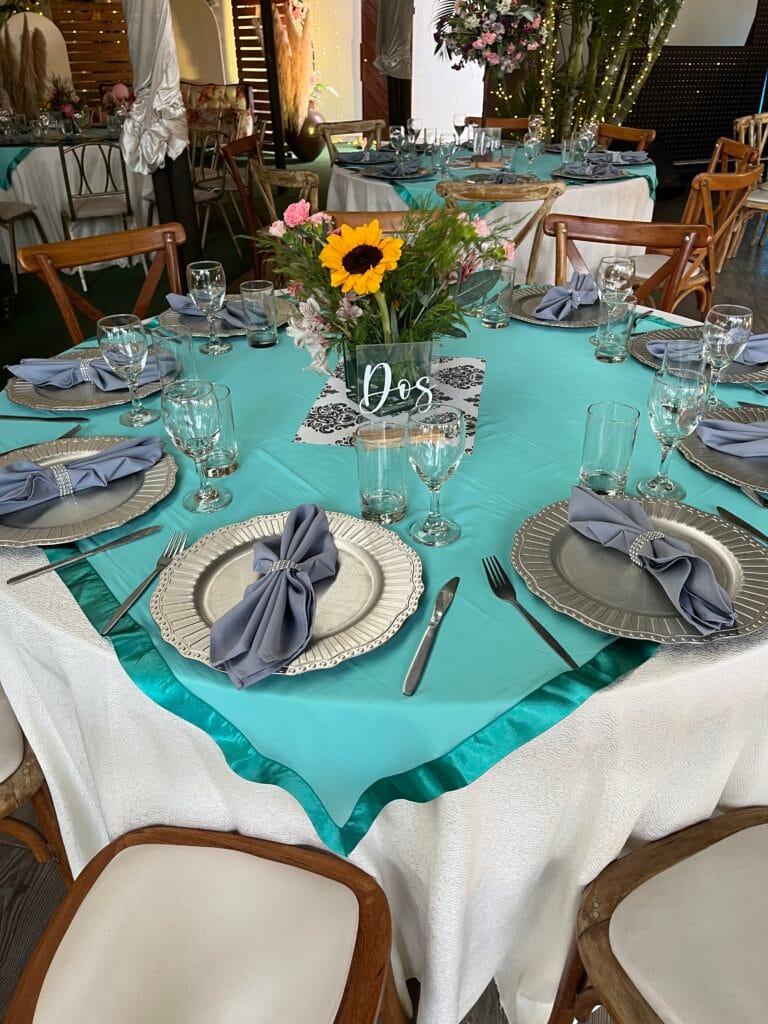 Las mesas estaban decoradas con un gusto impecable, predominando el vibrante color turquesa, combinado con manteles blancos y elegantes detalles plateados. Frescos arreglos florales, que incluían girasoles y una variedad de flores de colores, aportaban un toque de alegría y vitalidad. Cada mesa, identificada con un número, invitaba a los invitados a disfrutar de una velada exquisita.