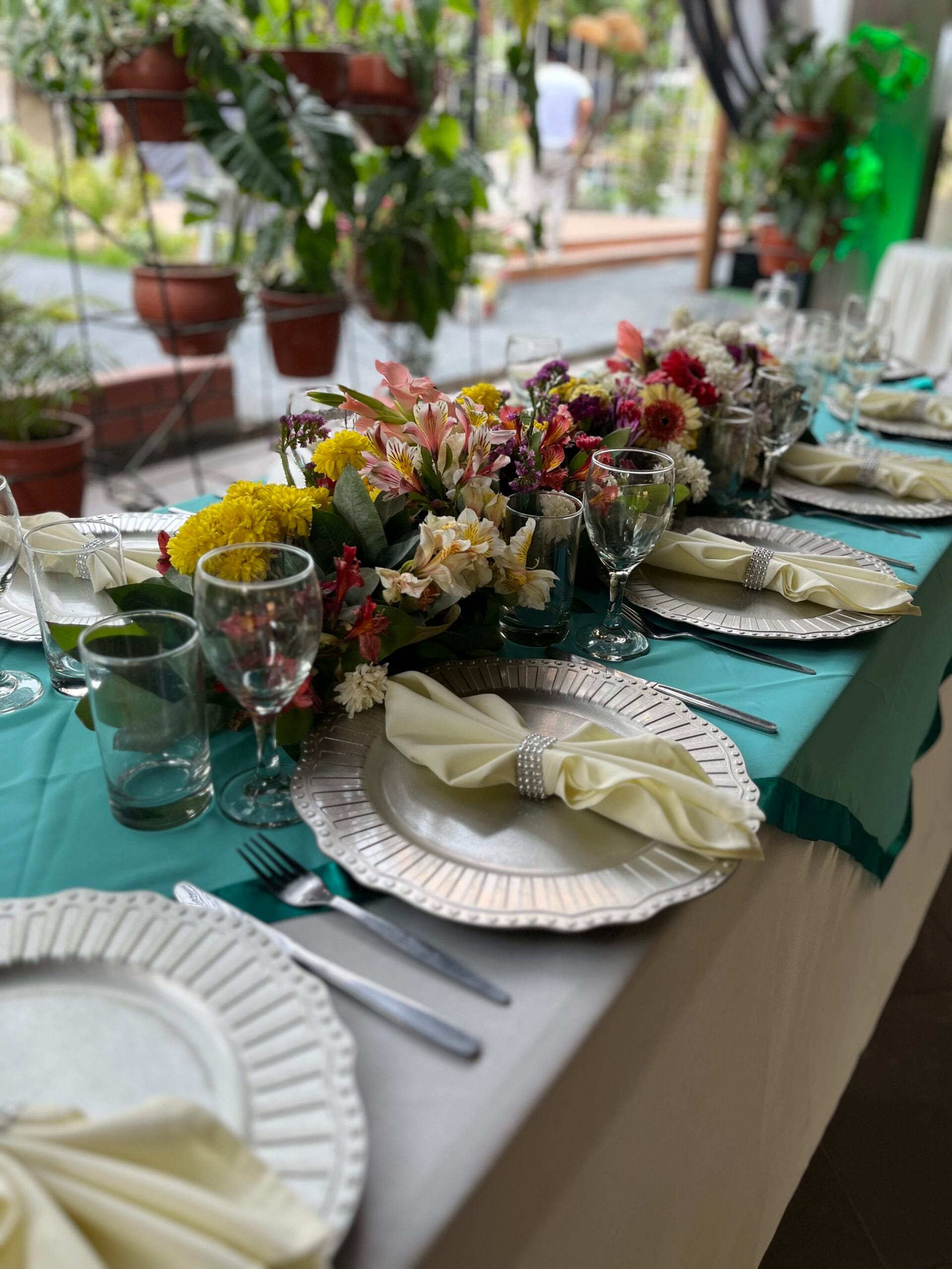 Las mesas estaban decoradas con un gusto impecable, predominando el vibrante color turquesa, combinado con manteles blancos y elegantes detalles plateados. Frescos arreglos florales, que incluían girasoles y una variedad de flores de colores, aportaban un toque de alegría y vitalidad. Cada mesa, identificada con un número, invitaba a los invitados a disfrutar de una velada exquisita.