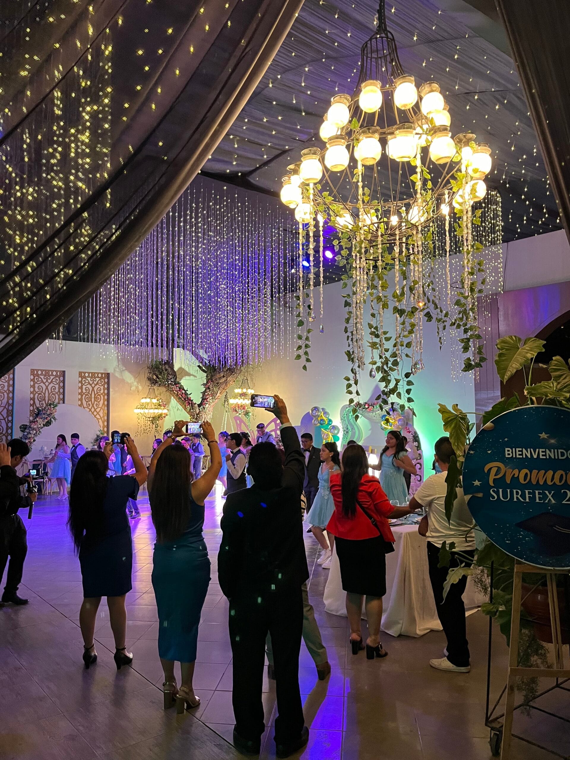 La celebración de la Promoción SURFEX se encendió en El Hueco con un ambiente fresco y lleno de energía. El gran photobooth con las letras «PROM 2024» y una decoración en tonos turquesa, dorado y plata, ofrecía el escenario perfecto. Cada graduado tuvo su momento de brillar, inmortalizando el fin de una etapa y el inicio de una emocionante aventura.
