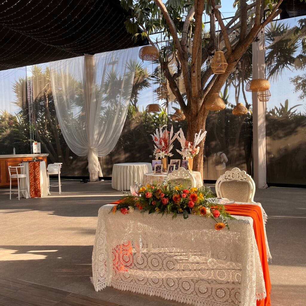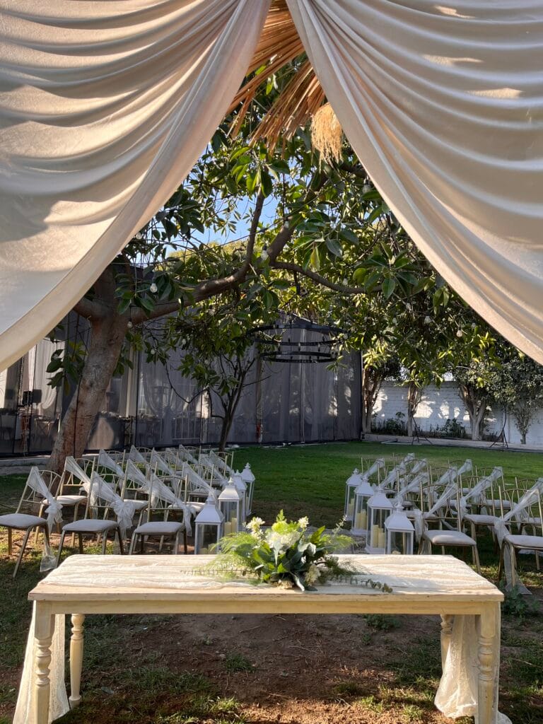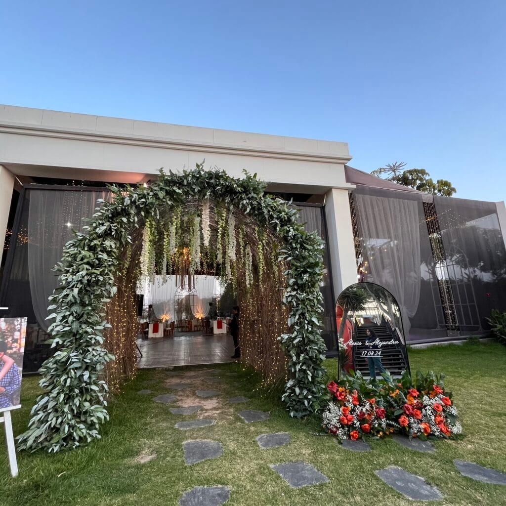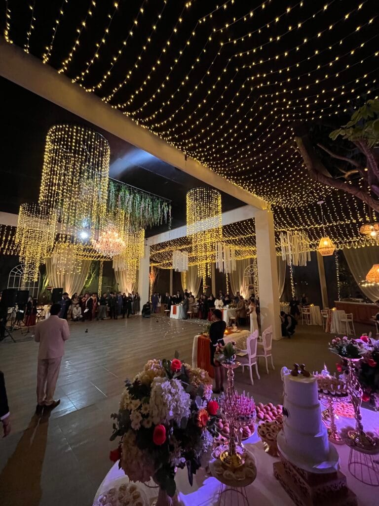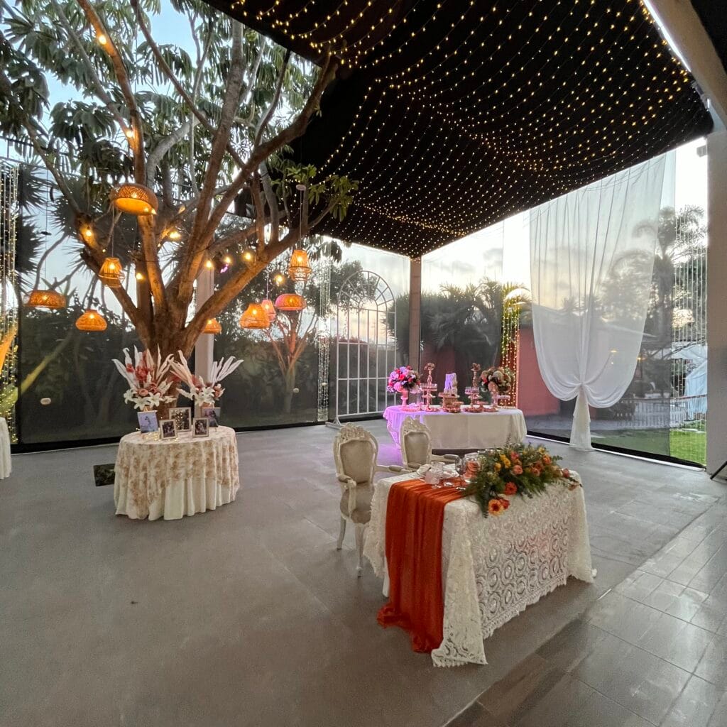 Cada mesa, identificada con una foto de la pareja, invitaba a los presentes a ser parte de esta historia. El rincón de los novios, enmarcado por el majestuoso árbol del jardín y adornado con cortinas vaporosas, se destacaba por su romanticismo. Un camino de flores en tonos cálidos y secos guiaba la mirada hacia una mesa adornada con encaje y un delicado pastel de bodas. A medida que la noche tomaba el control, miles de luces se encendían en el techo, transformando el jardín en un cielo estrellado.