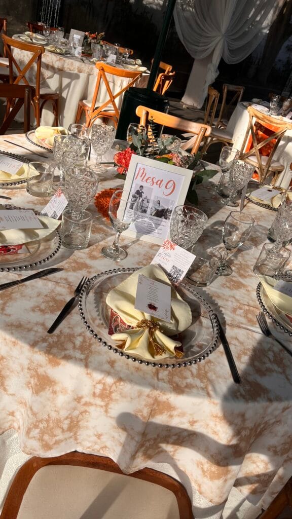 El sol se despedía tiñendo el cielo de tonos dorados y anaranjados, mientras el jardín de El Hueco se preparaba para una noche de celebración. Las mesas, vestidas con manteles claros que reflejaban la luz del atardecer, esperaban a los invitados. Los detalles eran un testimonio de amor y dedicación: copas de cristal tallado, servilletas adornadas con flores secas y centros de mesa que combinaban la frescura de las flores con la elegancia de los tonos tierra.
