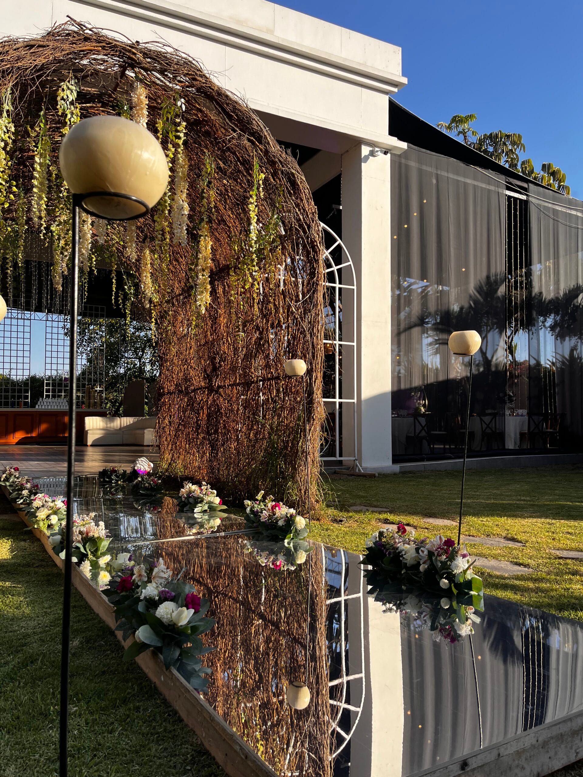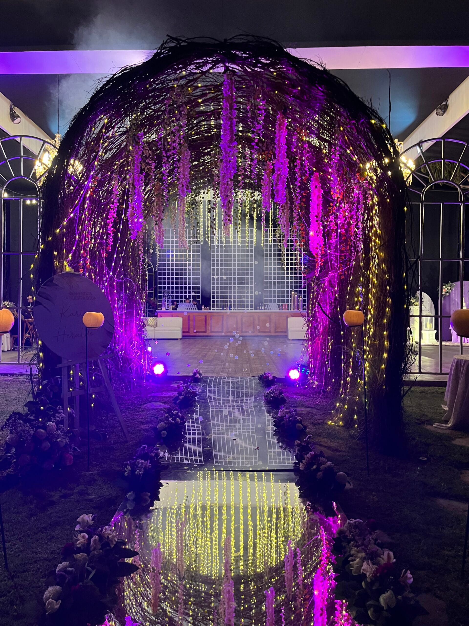 La noche llegó, y el jardín de El Hueco se transformó en un mundo de ensueño. El camino de entrada era un verdadero túnel de magia, un arco de ramas y luces que invitaba a los invitados a sumergirse en una historia de amor. A cada paso, un sendero luminoso los guiaba hacia un lugar donde la fantasía se hizo realidad.
