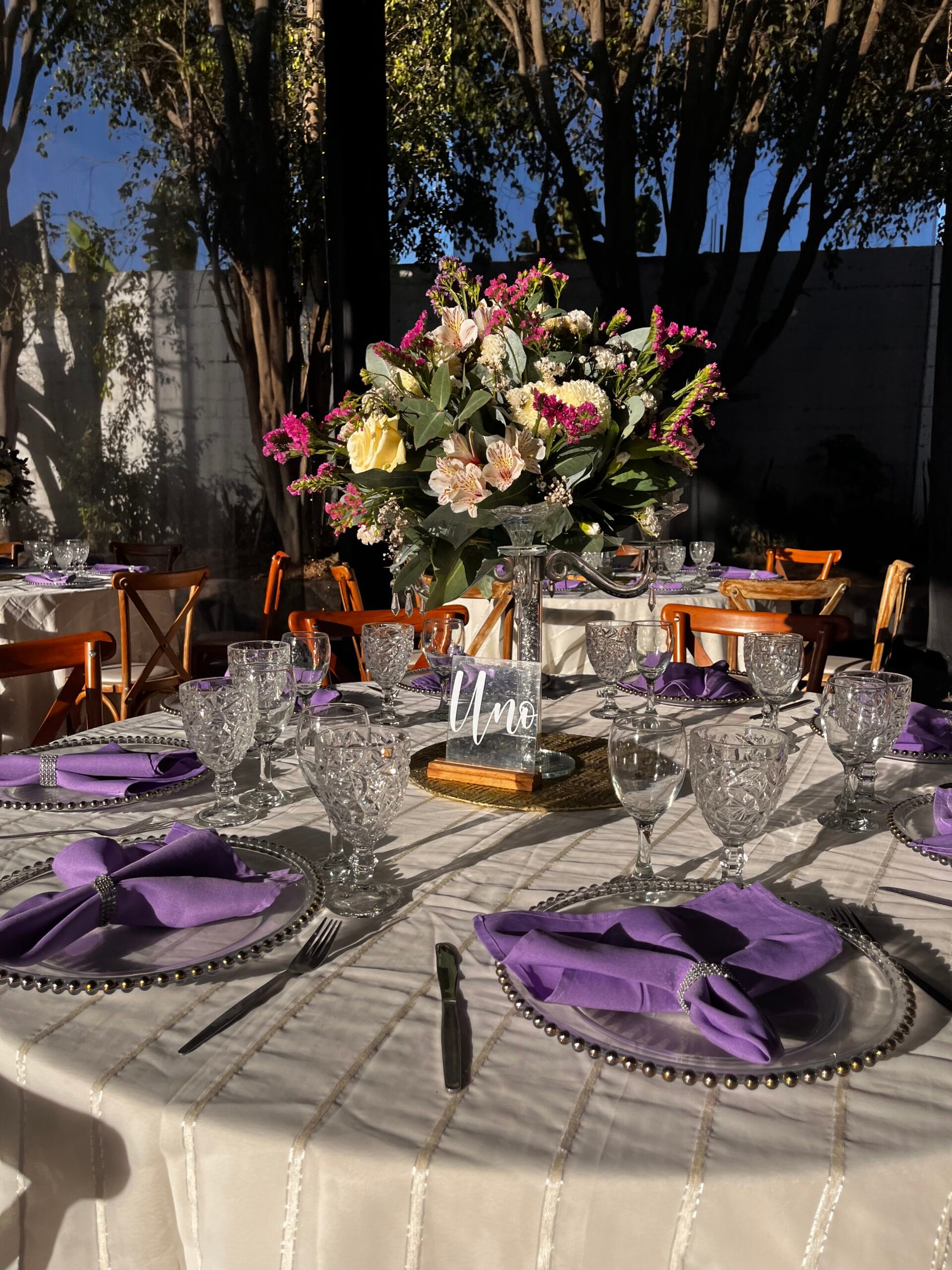 Las mesas, vestidas de un blanco impoluto, lucían arreglos florales que eran una obra de arte, mezclando tonos morados, rosas y blancos que se entrelazaban con la elegancia del lugar. Cada detalle, desde la delicada cristalería hasta las servilletas de un profundo color lavanda, hablaba de un amor que florecía. El punto central de la celebración era una mesa especial, donde un pastel de bodas de tres pisos se alzaba como la pieza principal, rodeado de luces y flores que lo hacían parecer flotar en el aire.