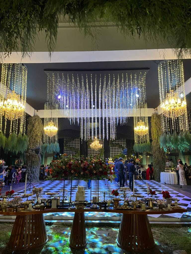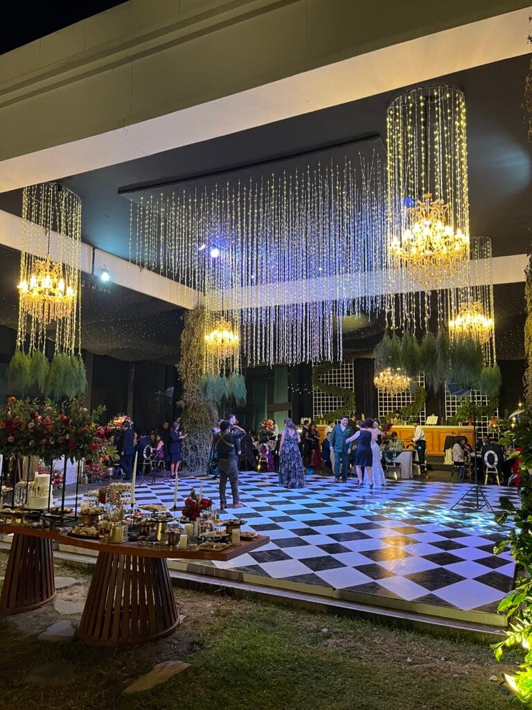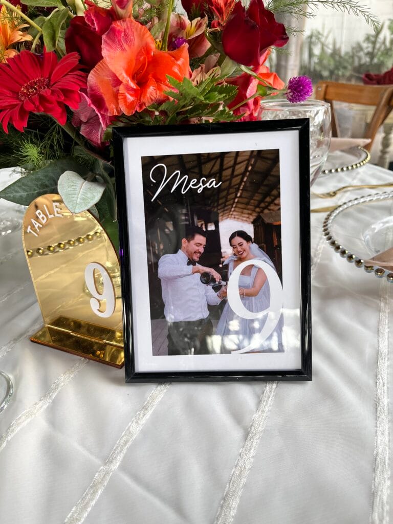 El camino de entrada invitaba a los invitados a un mundo de ensueño. Al cruzar el umbral, una pista de baile de cuadros blancos y negros brillaba bajo el resplandor de lámparas que parecían joyas colgantes. Las mesas, impecablemente decoradas, mostraban centros de flores en tonos rojos y naranjas, y cada una llevaba un número junto a una fotografía de los novios, un detalle personal que susurraba la historia de amor de Marita y José Antonio.