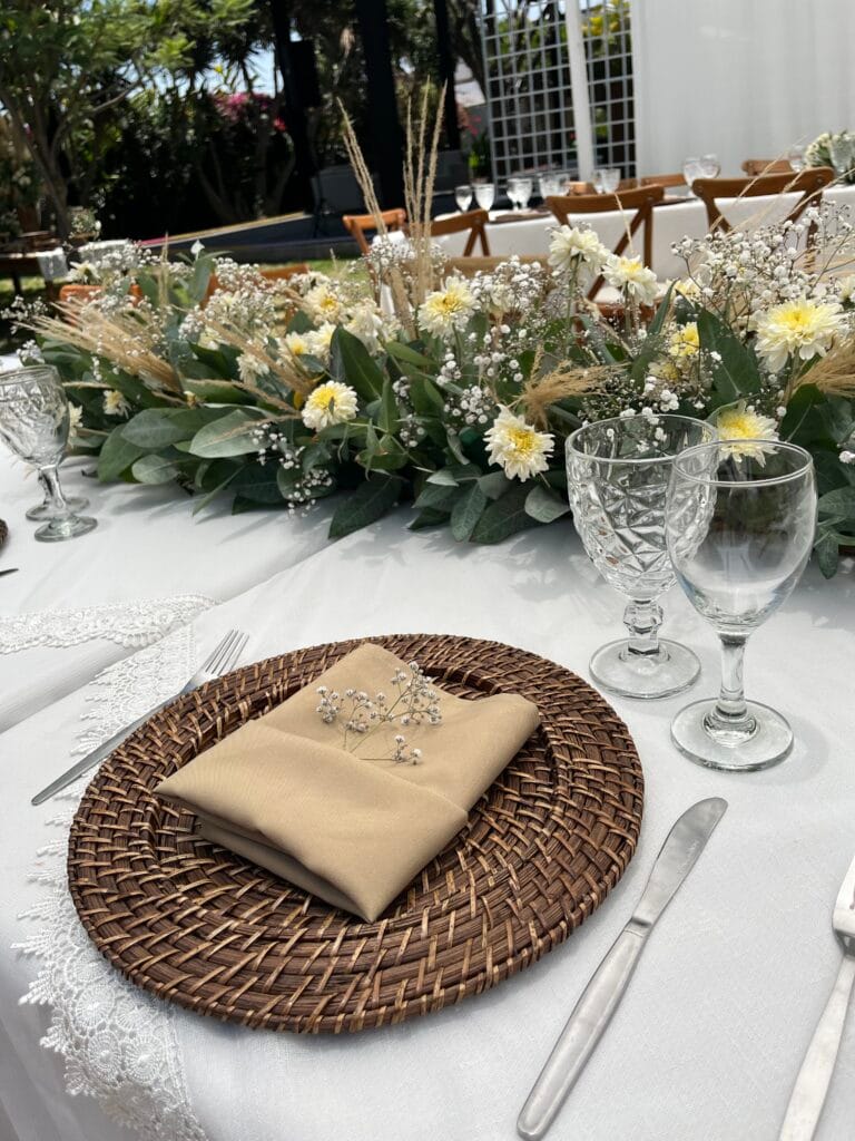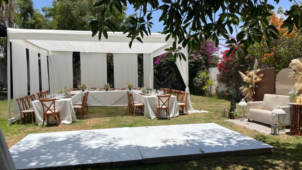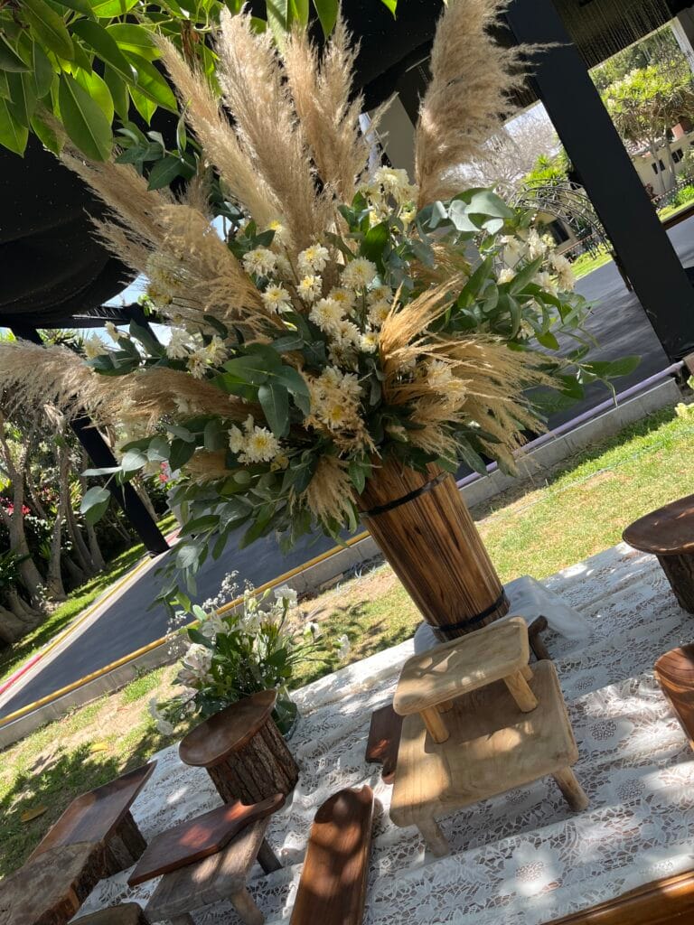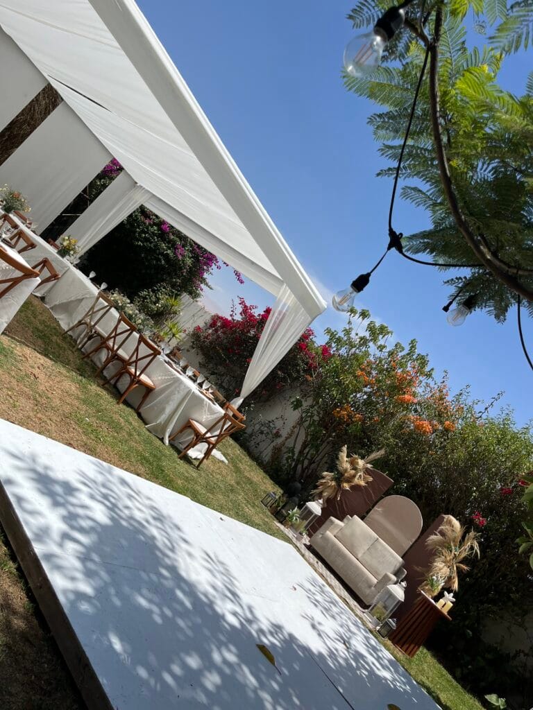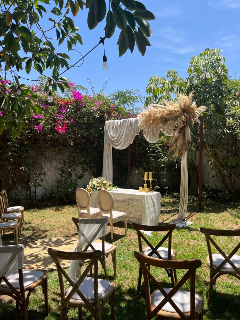 El sol de la mañana iluminaba el jardín de El Hueco, tiñendo de oro cada hoja y cada flor, creando el escenario perfecto para un «sí, acepto» que resonaría con la alegría de la naturaleza. Entre la vibrante buganvilla y el verde frondoso, un altar sencillo y elegante esperaba a la pareja. Un arco de tela suave y flores secas de pampa enmarcaba la ceremonia, mientras las sillas de madera, vestidas con delicados lazos, se alineaban sobre el césped, esperando ser testigos de un amor que se sellaría bajo el cielo abierto.