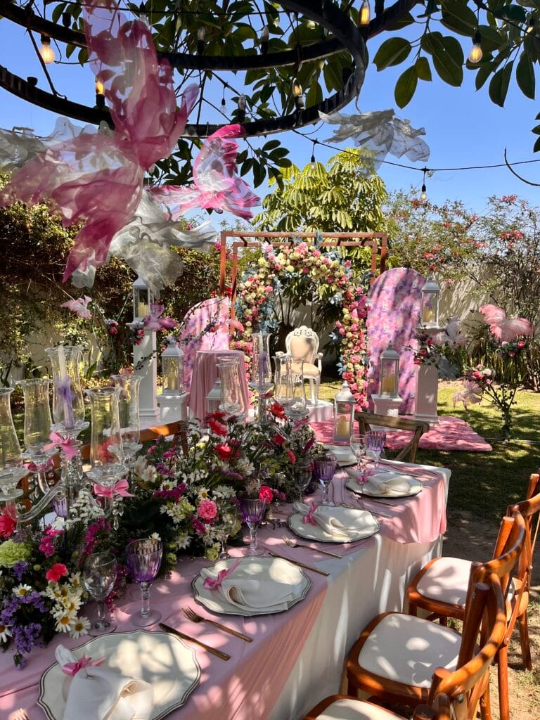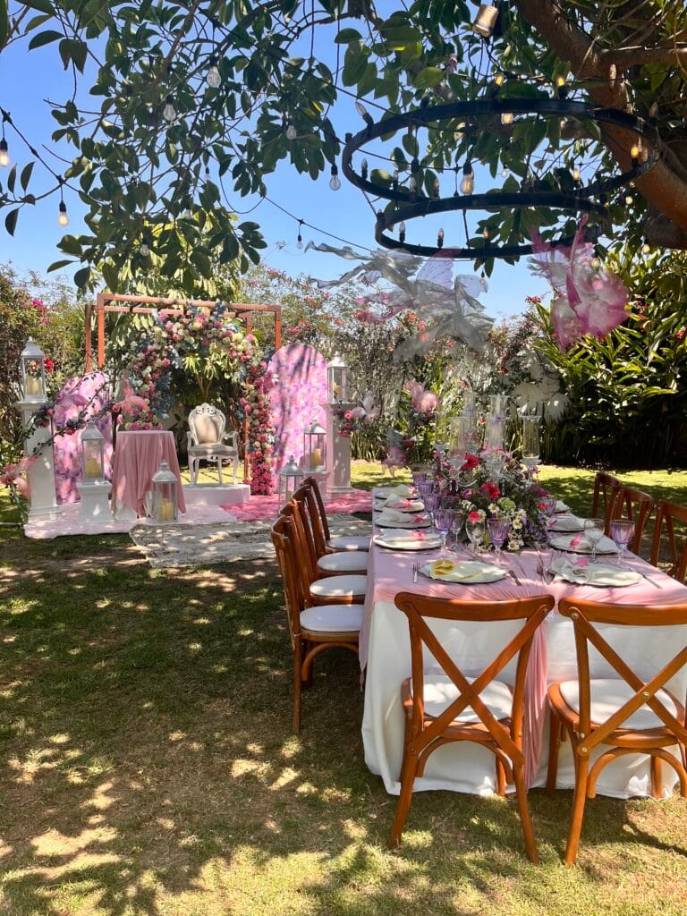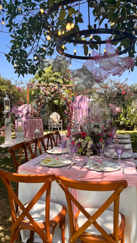 El sol de la tarde filtraba su luz entre las hojas de los árboles, iluminando un rincón secreto en el jardín de El Hueco. Allí, la magia se hacía presente en cada detalle. Una larga mesa esperaba a los invitados, vestida de un delicado color rosa que se mezclaba con el verde de la naturaleza. Al fondo, un escenario de ensueño, con un sillón de princesa y una cascada de flores, invitaba a la festejada a ser la protagonista de su propio cuento.