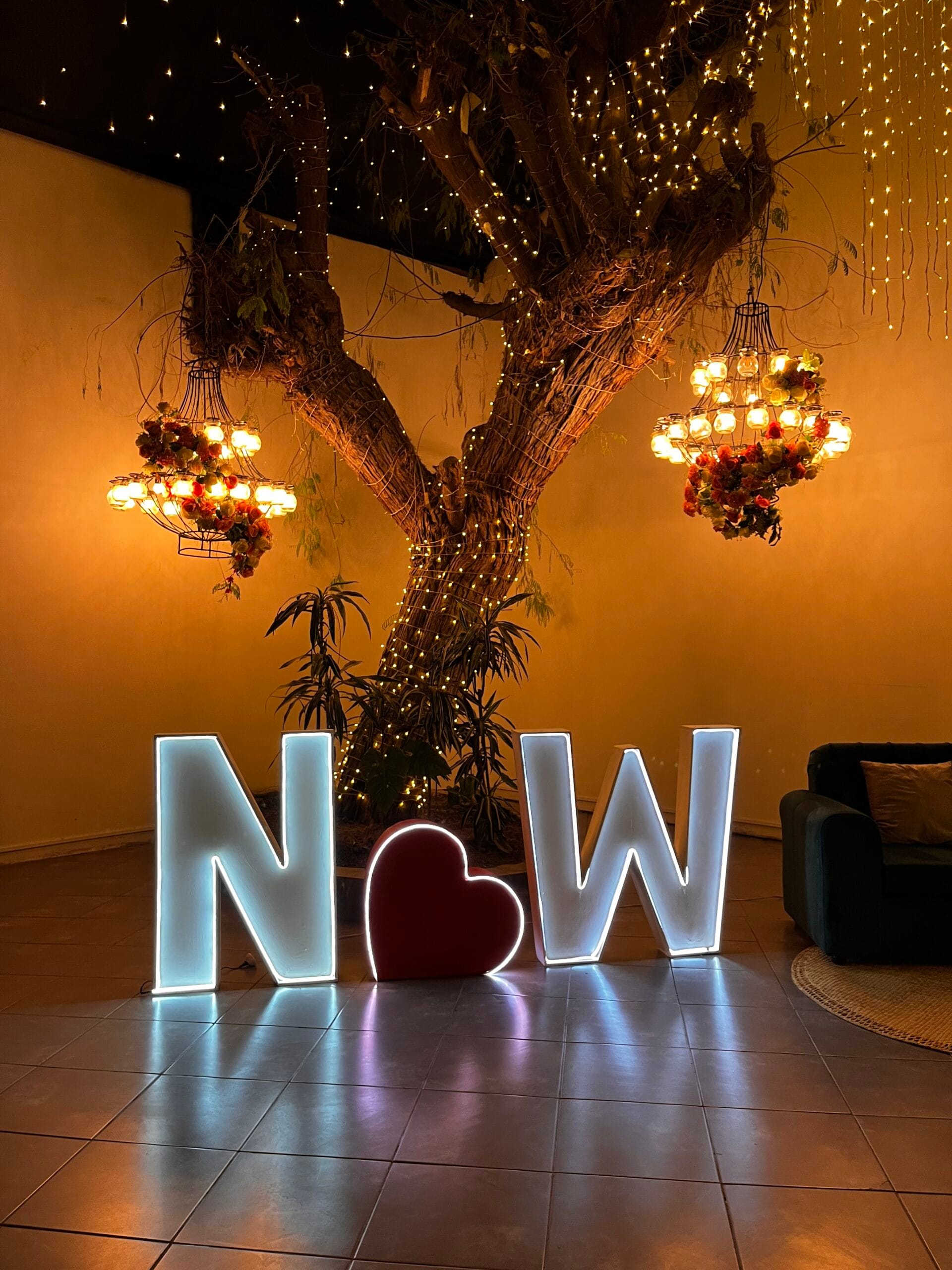 La ceremonia dio paso a una celebración llena de detalles que contaban la historia de la pareja. Las mesas, impecablemente vestidas de blanco, brillaban con platos de bordes dorados y delicados arreglos florales que parecían flotar. Cada brindis era un deseo, y cada sonrisa, una confirmación de la felicidad del momento. Al centro, un árbol envuelto en un manto de luces servía de testigo silencioso. A sus pies, las iniciales N ❤️ W se iluminaban, un sello de amor que recordaba a todos que el futuro es ahora.