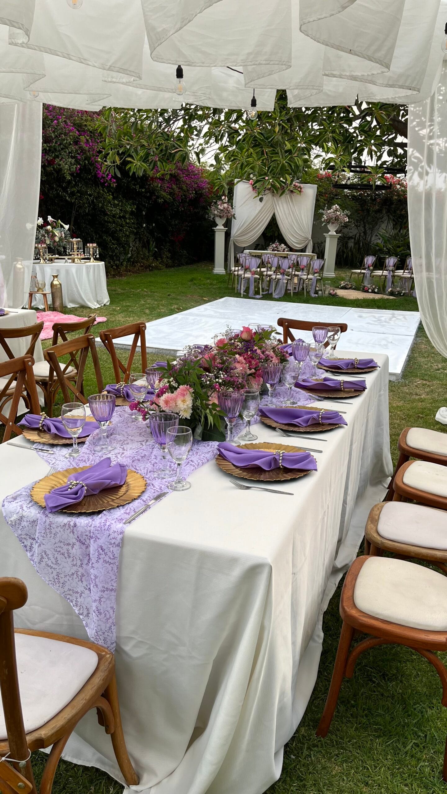 Un elegante toldo blanco, adornado con cortinas de suave tela, protegía las mesas, donde cada detalle hablaba de la personalidad de la pareja. Manteles con delicados estampados, servilletas en tonos lavanda y platos dorados se fusionaban con arreglos florales que eran pequeñas obras de arte, rebosantes de rosas y follaje. En un área más apartada, bajo la copa de un árbol majestuoso, las sillas se alineaban frente a un altar romántico, listas para ser testigos de un «sí, quiero» lleno de emoción. Era una celebración que no necesitaba de multitudes para ser grandiosa, sino de la conexión de almas que se unían en un ambiente de pura felicidad.