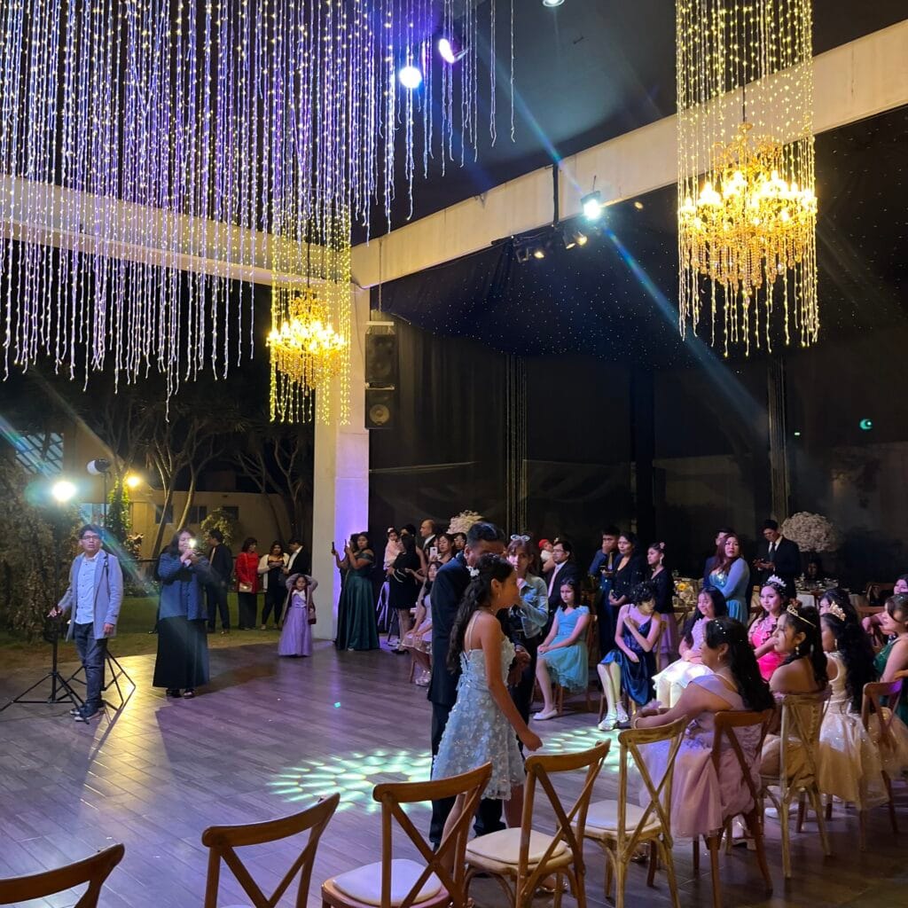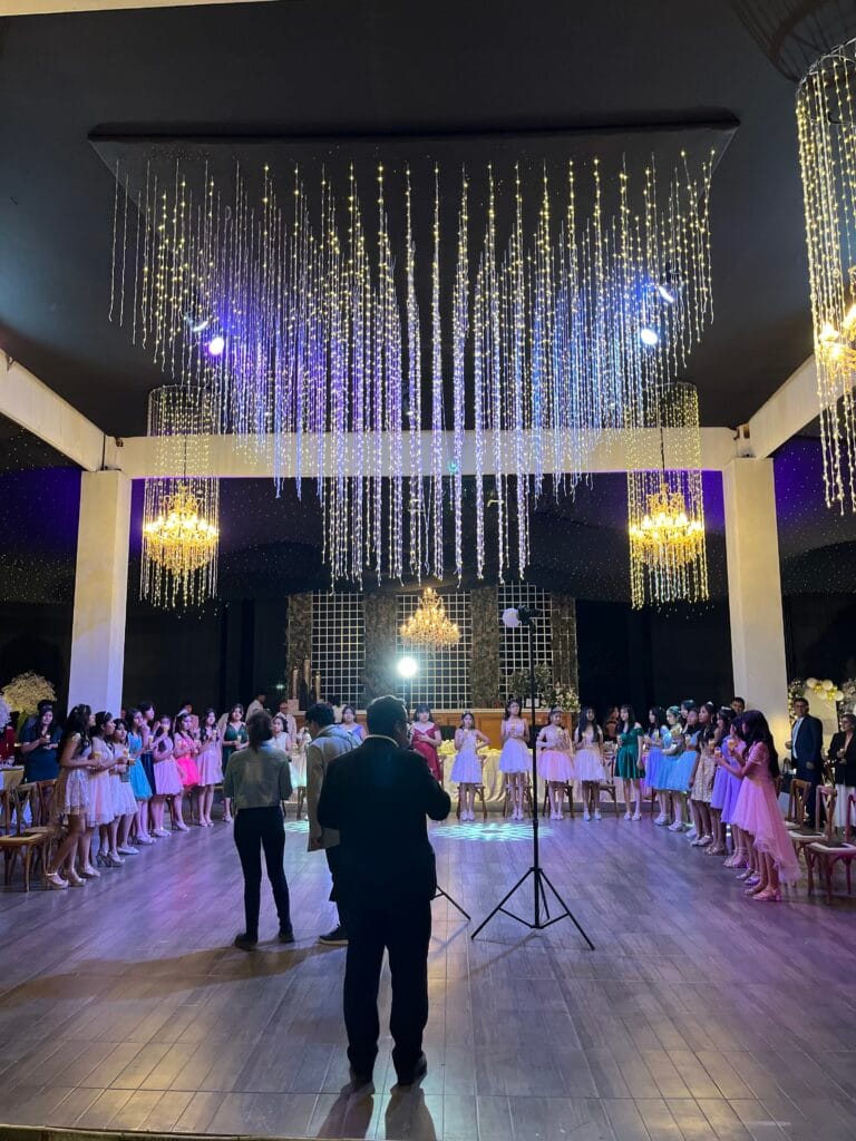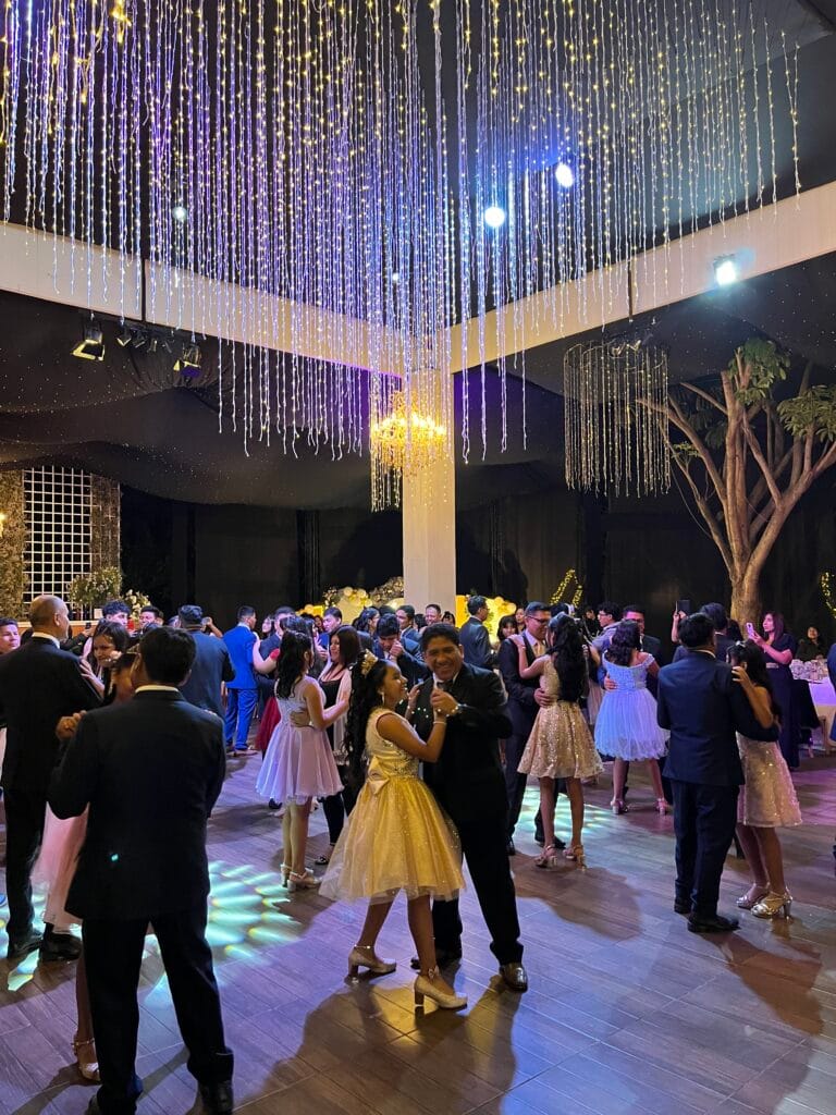 La pista de baile se convirtió en el corazón palpitante del evento. Bajo un techo de miles de luces centelleantes y resplandecientes candelabros, cada movimiento era pura alegría. Los jóvenes, elegantemente vestidos, se adueñaron del espacio, bailando y riendo, creando una atmósfera vibrante que solo una noche de promoción puede ofrecer.