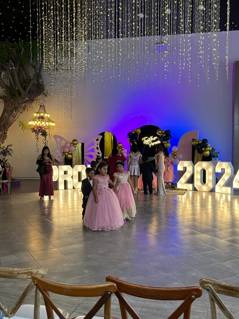 Mientras tanto, en la pista de baile, los más pequeños y sus familias disfrutaban de la fiesta. Bajo una cascada de luces centelleantes y una majestuosa lámpara de araña con vegetación, el ambiente era festivo y alegre. Los niños, vestidos para la ocasión, compartían risas y movimientos, celebrando juntos el fin de su primera gran etapa escolar.