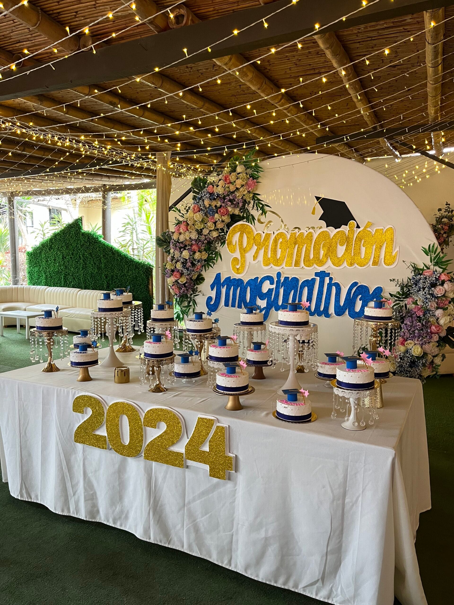 El ambiente estaba impregnado de alegría y calidez. Un área de la celebración destacaba con una mesa de postres espectacular, dedicada a la «Promoción Imaginativa». Cada pastelito, adornado con birretes miniatura y los colores de la celebración, era una pequeña obra de arte que representaba el logro de cada niño. Un detalle dulce y memorable para un día tan importante.