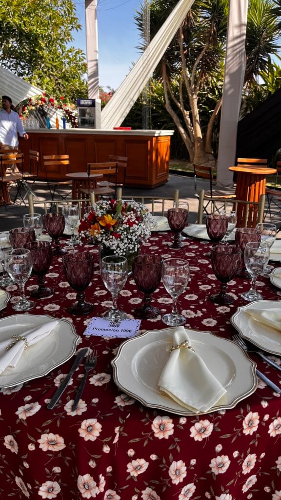 Las mesas lucían una decoración exquisita, con manteles estampados en tonos cereza y delicados arreglos florales que aportaban un toque de color y sofisticación. Vajillas elegantes y copas en tonos vino completaban la puesta en escena, invitando a los asistentes a disfrutar de una comida memorable. Todo el montaje estaba listo para una jornada de celebración.