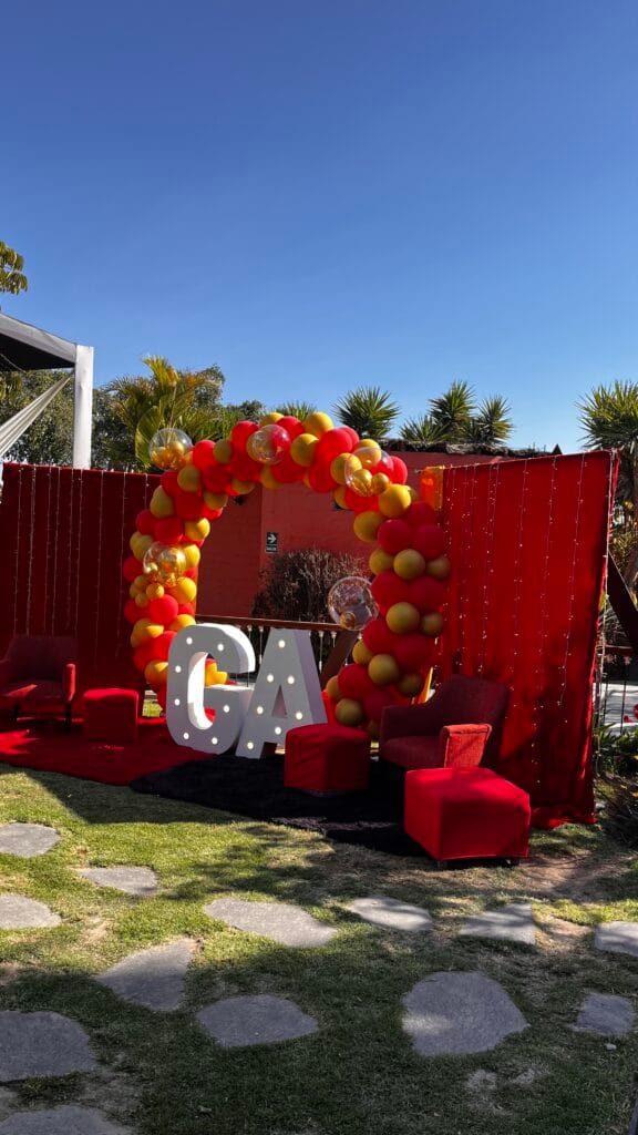 Un vibrante photobooth capturaba la esencia festiva con un gran arco de globos en rojo y dorado, flanqueando las letras luminosas «GA». Este espacio, lleno de alegría y color, se convirtió en el punto de encuentro para fotografías, donde cada sonrisa se inmortalizaba bajo el radiante sol. Un escenario perfecto para el recuerdo.