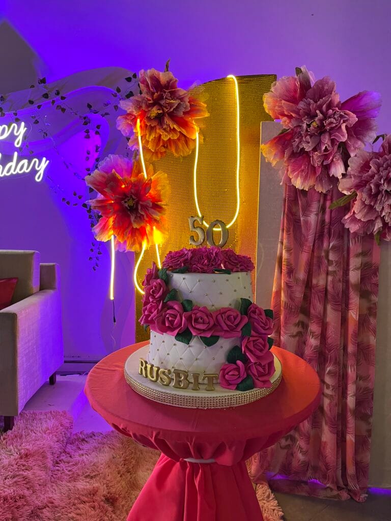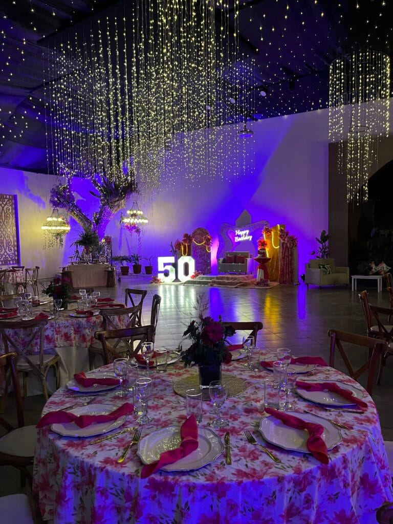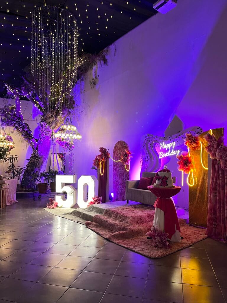 La noche se iluminó para celebrar medio siglo de vida. El salón de El Hueco se vistió de un profundo color rosa, y una lluvia de luces doradas caía en cascada desde el techo, creando un ambiente mágico y festivo.