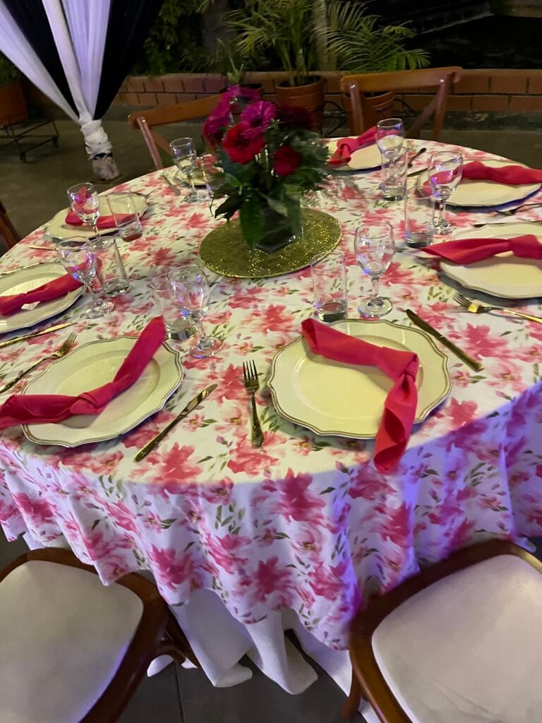 En el centro, un majestuoso número «50» brillaba con luz propia, un símbolo de la historia y los sueños cumplidos. Cada mesa, decorada con manteles de ensueño y arreglos florales que mezclaban la pasión del rojo con la elegancia del blanco, esperaba a los invitados para un banquete de emociones.